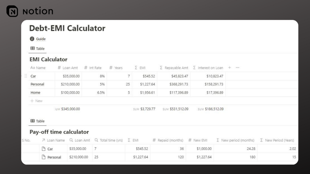 A notion template that helps in performing various calculations related to debt. It contains the following features: