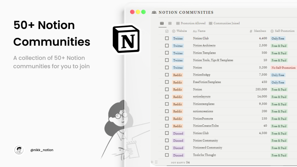 This template contains a collection of 50+ Notion communities that you can join to engage with fellow Notion users as well as buy & sell Notion templates.